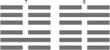 При таком способе построения четной гексаграммы часто будут встречаться случаи, когда верхняя и нижняя триграммы поменяются местами. А это означает изменение направления времени, то есть будущее и прошлое меняются местами. Обратный ход времени для нашей логики означает противоположное событие. Рассмотрим гексаграммы 7 и 8.