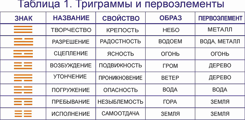 Согласно легенде, китайский император Фу Си (живший в 28–27 веках до н. э.) однажды увидел, как из реки Хуанхэ выплыла на берег огромная черепаха. На ее панцире были знаки, состоящие из трех черт (триграммы). Черты были сплошными (мужская энергия Ян) или прерывистыми (женская энергия Инь). Императору открылось, что в этих знаках закодирована вся система мироздания. Триграммам были даны названия. Каждой триграмме поставлен в соответствие первоэлемент, образ и свойство. Приведенный в таблице № 1 порядок следования триграмм назван именем создателя Фу Си. Смотрите таблицу 1: