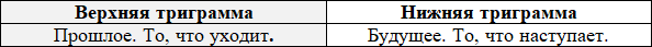 Таким образом каждая гексаграмма состоит из двух внешних и двух скрытых триграмм. И в той, и в другой паре верхняя триграмма характеризует уходящие события, а нижняя грядущие. Нижняя триграмма с течением времени как бы вытесняет верхнюю. Вклад обеих триграмм в текущий момент времени приблизительно одинаков.