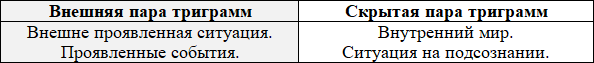 Внешняя пара триграмм (основная гексаграмма) описывает ситуацию во внешнем, проявленном мире, а скрытая пара триграмм (подсознательная гексаграмма) описывает внутренний глубинный слой ситуации. Проводя аналогию, можно сказать, что внешняя пара триграмм описывает мир проявленных событий, а скрытая описывает подсознательный план.