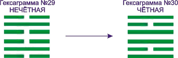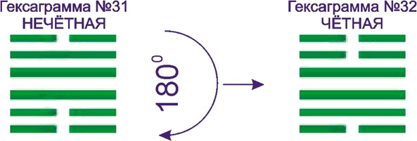 Если же при таком повороте гексаграмма переходит сама в себя, то все ее черты заменяются на противоположные.