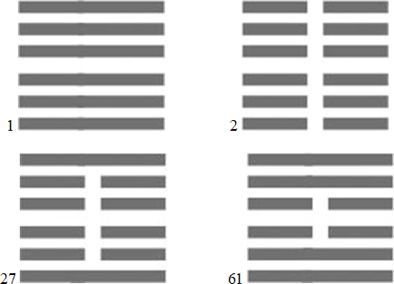 Вэнь-ван (царь – родоначальник династии Чжоу, живший в 12 веке до н. э.) расположил триграммы одна над другой так, что получились гексаграммы состоящие из шести черточек. Восемь триграмм образовали (8×8=64) 64 гексаграммы.
