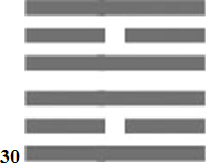 Гексаграмма 30 называется «Любовь земная». Две внешние одинаковые триграммы «Огонь». Это означает на проявленном мире в прошлом и в будущем: абсолютную ясность, жар и полыхание страстей, сцепление с ситуацией (огонь зацепился за дрова и без дров существовать не может). Недаром молодожены часто вешают замочек со своими именами, как символ их союза.