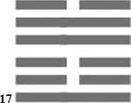 17 называется «Раболепие». Одна из немногих гексаграмм, чье название пришло из подсознательного уровня. На подсознании: верхняя скрытая триграмма – это «Дерево» (часто толкуется как личность самого вопрошающего) и нижняя скрытая триграмма – это «Гора» (часто толкуется как мощная, незыблемая идея, концепция, учение). За человеком прошлое, за концепцией будущее. Идея или концепция на тонком плане вытесняют самого человека и ему нет места в будущем. Это вера в учение или авторитет, которая вытесняет Высшее Я человека с тонкого плана.