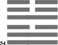 Называется «Любовь Безусловная», древнее название «Невеста». Часто ли бывает человек «Невестой»? Мужчина – никогда, женщина – в непродолжительный период своей жизни. Так почему такое название? Здесь ярко проявляется расширительный принцип толкования гексаграмм: любая жизненная ситуация может быть отнесена к одной из 64 гексаграмм Книги Перемен. Это значит, что трактовать гексаграмму нужно очень широко, иначе невозможно будет охватить всю реальность. Здесь человек – «Невеста» Высших сил, «Невеста» Бога. Он становится «Невестой», когда его посещает «Любовь Безусловная». Верхняя скрытая триграмма «Вода», как океан и большая опасность на тонком плане. Древняя фраза: «Невеста еще не жена, если она не будет крайне смиренна, большой беды не избежать». Загадку этой многомерной, парадоксальной гексаграммы возможно удастся разгадать в будущем…