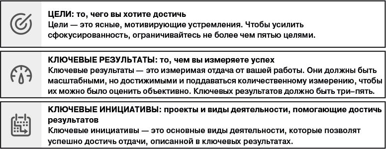 Вот уже более полувека OKR помогают тысячам самых успешных компаний всего мира выполнять поставленные задачи и оставаться в числе лидеров. Методика целеполагания обеспечивает сосредоточенность, ответственность, ясность и целеустремленность; благодаря ее простоте и структурированности многие руководители предпочитают ее всем другим инструментам организации труда. OKR могут помочь также вам и вашей команде, обеспечивая рост, согласованность и гибкость в периоды, когда без этих факторов просто невозможно выжить.