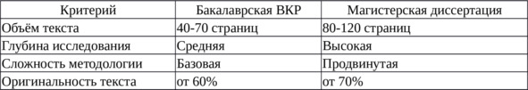 Таблица 1 – Сравнение бакалаврской и магистерской ВКР по ключевым критериям