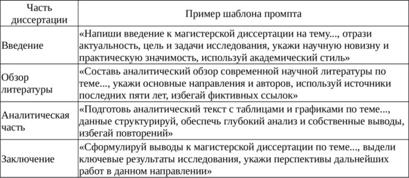 Таблица 10 – Примеры эффективных шаблонов промптов для разных частей ВКР