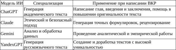 Современные инструменты искусственного интеллекта (ИИ) существенно расширили спектр возможностей, доступных для научных исследований, позволяя студентам проводить исследования быстрее и качественнее. Сегодня ИИ-инструменты представлены в нескольких основных категориях, включая генерацию текста, автоматический поиск источников, создание аналитических таблиц и проведение анализа больших массивов данных. Среди наиболее востребованных инструментов выделяются нейросетевые модели, такие как ChatGPT, Claude, Gemini и YandexGPT, каждая из которых обладает уникальными возможностями и подходит для разных этапов написания выпускной квалификационной работы, таблица 4.