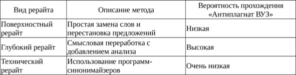 Таблица 7 – Типы рерайта и вероятность прохождения антиплагиата