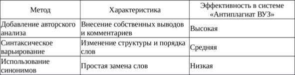 Как отмечается в исследованиях В. А. Мустакимова, академический рерайт «представляет собой глубокую смысловую перестройку исходного материала с обязательным включением авторского анализа и новых выводов, что делает текст не просто уникальным, а качественным и информативным» [7, С. 152—159]. В связи с этим поверхностный рерайт, сводящийся к замене слов синонимами или изменению порядка предложений, легко выявляется системами проверки и помечается как подозрительный.