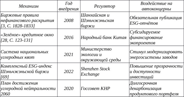 С конца 2000-х годов китайская нормативно-институциональная среда усилила давление на корпоративный сектор: биржевые правила раскрытия нефинансовых показателей, «зелёные окна» кредитования Народного банка и национальная цель углеродной нейтральности 2060 года сформировали многоуровневую систему ожиданий. Расширение объёма раскрытия SAIC, FAW, BAIC, Geely Auto и GAC Group коррелирует с плотностью отраслевых директив, что будет детально проанализировано далее.