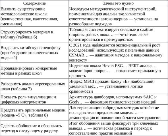 Финальное обобщение структурировано чётко и академически корректно. Автор формулирует три вывода, каждый из которых развивает и обобщает ранее изложенные наблюдения. Первый фиксирует значение количественных методов, но указывает на их объяснительную ограниченность. Второй подчёркивает, что адаптация к китайскому регуляторному контексту обеспечивает воспроизводимость. Третий делает акцент на значимости цифровизации и визуализации как доказательного инструмента. Последнее предложение – Полученные наблюдения задают основу для следующего параграфа… – выстраивает логическую связку с будущим анализом практик конкретных компаний, тем самым завершая параграф не просто утверждением, а мотивированным переходом.