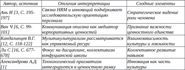 Терминологическая база параграфа обогащена авторскими толкованиями (таблица 12). Реляционная проекция показывает разнообразие акцентов: Ань И [3, С. 195—197] делает упор на стратегическое сопряжение мотивации и инновационного развития; Ван Ч [6, С. 99—101] выделяет коммуникативную пластику культуры как усилитель вовлечённости; Кандалинцев В. Г. [12, С. 118—122] подчёркивает мультикультурализм как средство преодоления национальных барьеров; Ли С в кейсе Huawei настаивает на неразрывности дисциплины и коллективного самосовершенствования: «корпоративная культура Huawei определяется «единством личной дисциплины и коллективного самосовершенствования» [16, С. 677—678]; Александрова А. Д. [1] акцентирует технологический прагматизм как ядро ценностной матрицы Xiaomi.
