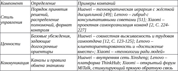 Дальнейшее раскрытие сущности категорий целесообразно через анализ структурных компонетов культуры. Обобщение эмпирических наблюдений представлено в Таблице 1. Основные компоненты корпоративной культуры ТНК Huawei, Lenovo, Xiaomi; структура таблицы фиксирует элементы «стиль управления», «ценности», «коммуникация» и соответствующие примеры. Сопоставление позволяет выделить доминирующий для китайских ТНК авторитарно-патерналистский стиль, базовые конфуцианские ценности и высокую интенсивность горизонтальных цифровых каналов; наблюдаемые закономерности суммируются в выводах параграфа (см. выводы в конце подраздела). Как показывает Таблица 13, конфигурация компонентов образует иерархическую модель, в которой ценности задают стратегический вектор, стиль управления выполняет регулятивную функцию, коммуникация обеспечивает операционную согласованность.