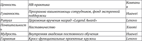 Позиционирование конфуцианских принципов в таблице 14 демонстрирует системную интеграцию этических категорий в HR-процессы. Каждая ценность получает институциональное оформление: гуманность выражается через социальный пакет, почтительность – через наставнические пары, гармония – через фокус-группы.