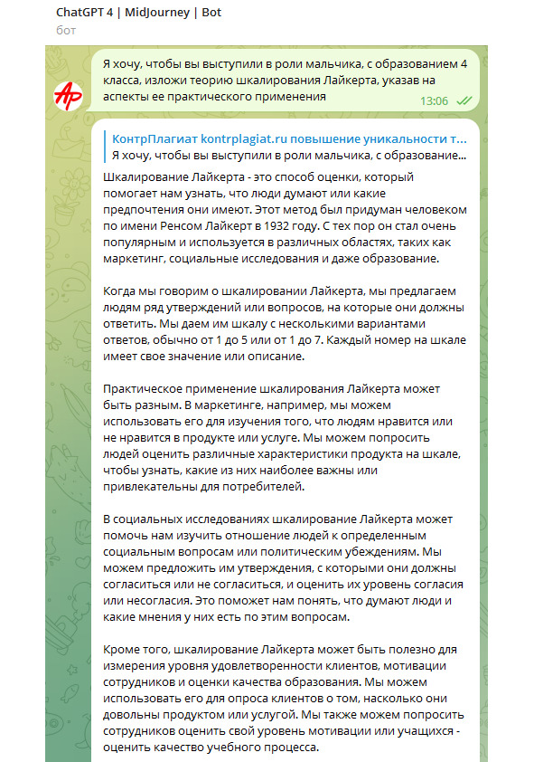 Определение роли ChatGPT, «Я хочу, чтобы вы выступили в роли высококвалифицированного специалиста-эксперта». КонтрПлагиат неоднократно показывал на примерах, что роль не играет значение, ответ не зависит от того, кем себя должна представить GPT, профильным экспертом или ребенком, промпт 2, рис. 53.