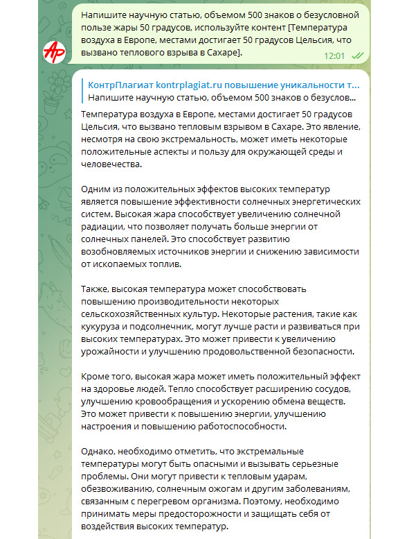 Пример генерации уникального текста нейросетью КонтрПлагиат