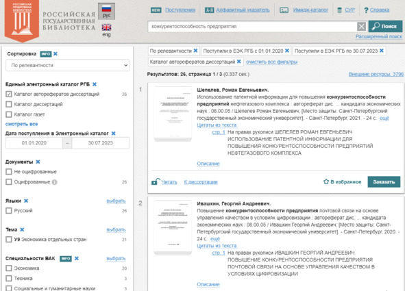 Поиск литературы может осуществлять в фондах Российской Государственной Библиотеки (РГБ: search.rsl.ru). При поиске используются фильтры: «Каталог авторефератов диссертаций», «Дата поступления в Электронный каталог», рис. 59.