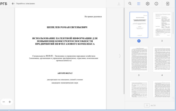 1. Шепелев, Р. Е. Использование патентной информации для повышения конкурентоспособности предприятий нефтегазового комплекса: автореферат дис. … кандидата экономических наук: 08.00.05 / Шепелев Роман Евгеньевич. – Санкт-Петербург, 2021. – 24 с.