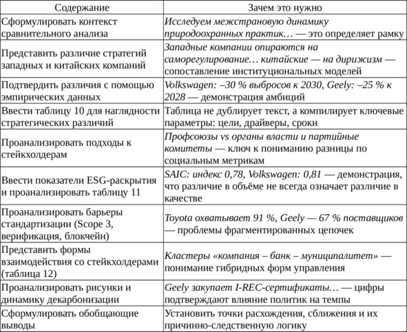 Перед созданием текста параграфа 1.3 студенту необходимо понимать: его цель – выявить, обобщить и проанализировать различия и сближения между CSR-практиками транснациональных автоконцернов на фоне различных институциональных условий. Этот раздел не повторяет предыдущие, а применяет выработанный понятийный и методологический инструментарий к сравнительному анализу. Структура текста должна быть выстроена так, чтобы логично перейти от различий к точкам пересечения, от описания механизмов – к выявлению общих трендов, от отдельных примеров – к системным выводам. Исследование в этом параграфе выполняет не столько теоретическую, сколько прикладно-аналитическую функцию.