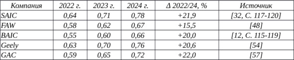 Таблица 8 – Сводный индекс «5 С» для SAIC, FAW, BAIC, Geely, GAC (2022—2024)