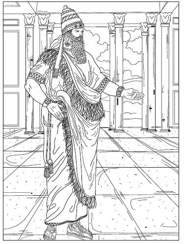 Символами царской власти служила митра – головной убор в форме расширяющегося цилиндра с округлым верхом, украшенный золотом и драгоценными камнями, и золотой скипетр в виде посоха. Бороду царь завивал по ассирийскому обычаю.