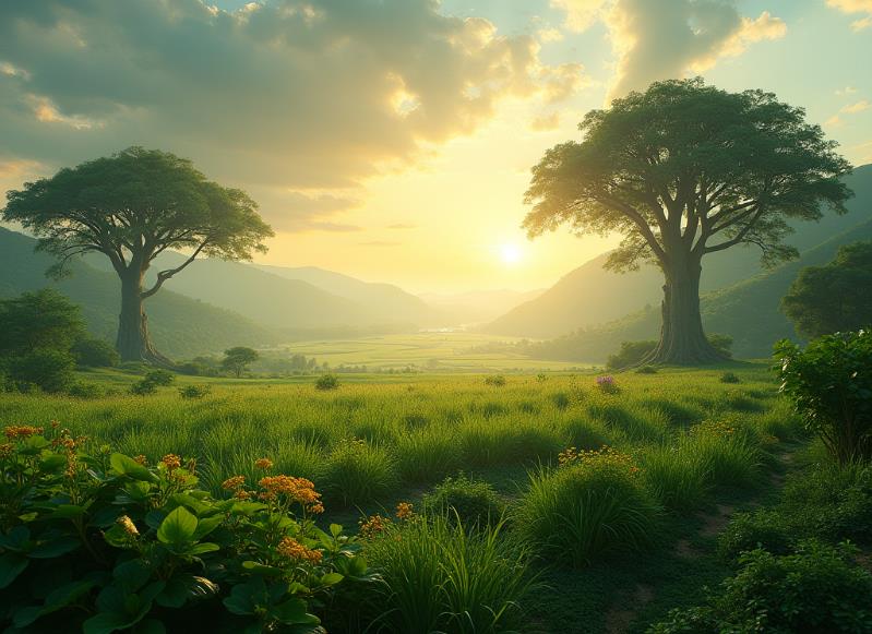 Песчаный ветер растворился в воздухе, как призрачная вуаль, уступив место живительной прохладе. Барханы исчезли, как сон на рассвете, и перед нами раскинулась бескрайняя равнина, укрытая изумрудным покровом буйной растительности. Трава пела под ногами древнюю песню, а вдалеке серебряными лентами извивались реки, будто нити в ткани мироздания. Воздух был напоен ароматами цветущих деревьев и влажной земли, хранящей память о недавних дождях. Восходящее солнце окрашивало вершины исполинских деревьев в золото, их могучие кроны, казалось, подпирали само небо.