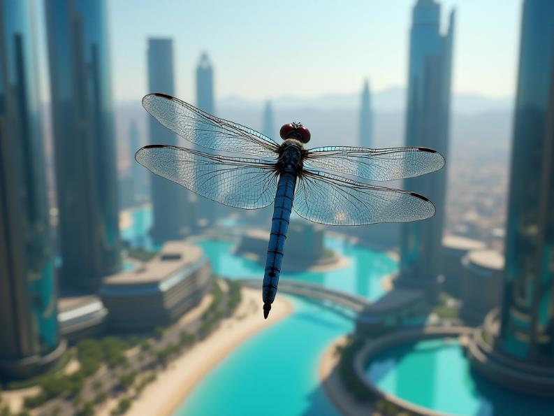 Илонка на мгновение задержалась на террасе, окинув меня загадочным взглядом, прежде чем исчезнуть за изящной балюстрадой. В следующий миг её стрекоза расправила свои хрустальные крылья, и они вспыхнули в солнечном свете, рассыпая вокруг каскад радужных бликов. Полёт был стремительным и точным – крылья пели на одной ноте с тёплыми потоками воздуха, поднимающимися от раскалённых песков пустыни к вершинам небоскрёбов.
