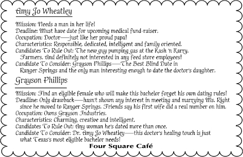 Not that she was anxious to meet him, or, for that matter, to even attend tonight’s function in Austin. No, she was simply curious about the man so many had praised as the perfect blind date. After her father had informed her he’d made the arrangements, Amy had gotten rave reviews on the man from everyone she’d met. She couldn’t remember any outsider who’d moved into the area who had been so totally accepted by the residents of Ranger Springs and beyond.