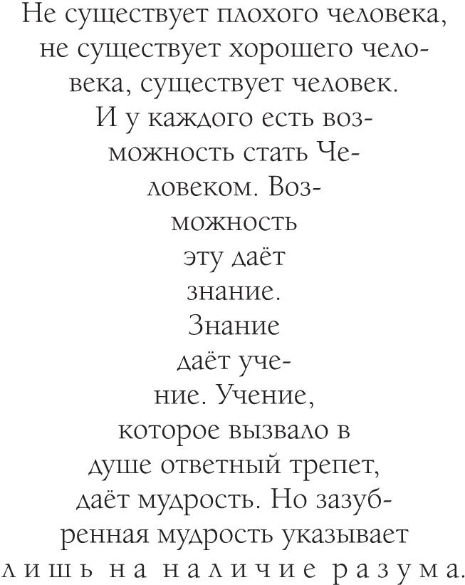 Человек должен отдавать себе отчёт в своём поступке. Всё, что я делаю другому, я получаю обратно вдвойне: делаю хорошее – получаю обратно вдвойне, делаю плохое – получаю обратно вдвойне. То, что человек, сделав плохое, падая, ломает кость, означает маленькое наказание за маленькое преступление. Ему ещё повезло, что наказание последовало сразу. За большой грех расплата приходит позже, порой даже в будущей жизни. Кто жалуется на свою трудную судьбу, пусть подумает, что это есть искупление за грехи предыдущей жизни. Если человек по недомыслию совершает плохой поступок, придёт наказание, а если делает это осознанно и преднамеренно, то последует большая кара. Особенно распространены в нынешнее время ругань, проклятия, злорадство, преступления. Наказание ждёт своего часа.