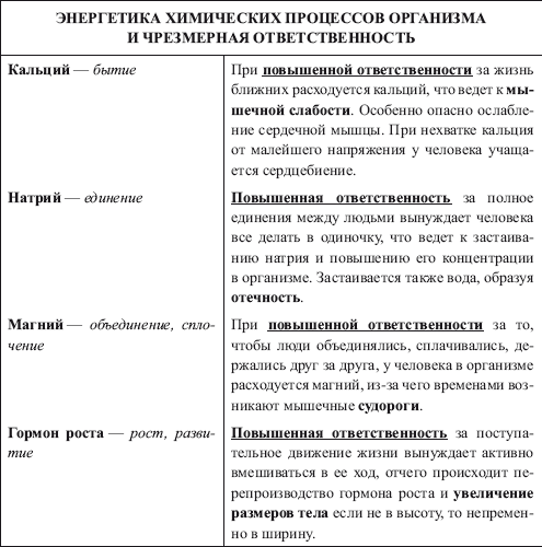 Страх превращает потребности в желания, а ответственность – в обязанность. Ответственность за чужую жизнь является самой тяжкой обязанностью, ибо тем самым человек совершает грех. Он лишает другого человека возможности жить его собственной жизнью. Чем выше обязанности, тем больше человек живет во имя внешней формы и тем больше перегружает кору надпочечников. Та вынуждена вырабатывать все большее количество гормонов, к которым относится и альдостерон. Гормоны приводят в движение химические процессы, протекающие в организме. Подобно тому, как добросовестный человек спешит туда, куда не надо, так и химические вещества в его организме под воздействием избыточного альдостерона спешат туда, куда не надо – за пределы тела.
