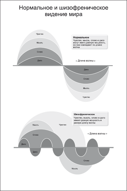 Отчего возникает шизофрения? Оттого, что человек живет чужими иллюзиями. Прежде всего иллюзиями своих родителей, воспитателей. Кто-то ждет от него одного, другой – другого, третий – третьего, четвертый еще чего-то. Чем больше человек напрягается, веря в то, что он сможет, тем вероятнее заболевает шизофренией, при которой чувства, мысли, слова и деяния существуют на волнах разной длины и не совпадают между собой. Почему так происходит? Потому что это не его чувства, мысли, слова и деяния. Они принадлежат другим людям. Подобно тому как эти люди не подходят друг другу, не принимают друг друга за своего, друг с другом враждуют, так и у шизофреника в голове все перепутано, и он не способен сам справиться с житейскими проблемами. Он желает нравиться всем, но не может справиться сам с собой и потому начинает сам себя бояться.