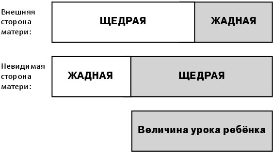 Первая мать по всем внешним признакам является человеком щедрым и сердечным, а потому в основном она хорошая. Очень редко в ней проявляется необычная жадность, что, однако, идёт на благо семьи, и поэтому жадность никого не тревожит. Люди совершенно чужие воспринимают эту мать совсем по-другому, но встречаться с ними приходится не часто, и потому их оценка несущественна. Ребёнок вобрал для себя именно эту мать и учит заданные ею уроки. К огорчению матери и семьи, у ребёнка начинают проявляться признаки жадности, которые всё усиливаются, причиняя большие страдания. Почему? Почему у такой хорошей матери вырос такой недостойный и падкий на деньги ребёнок, готовый променять на деньги всё?