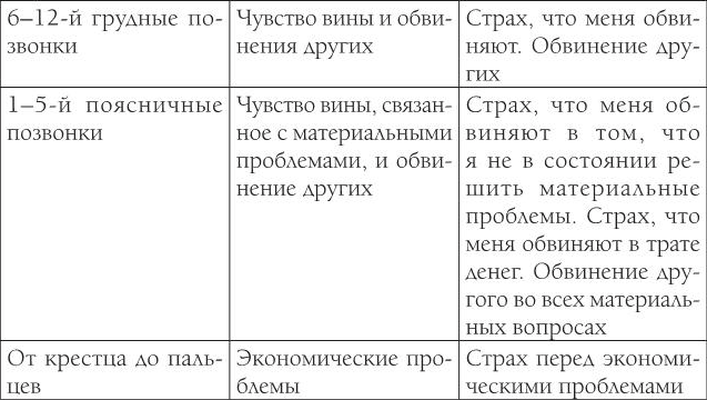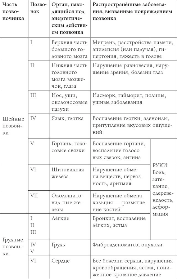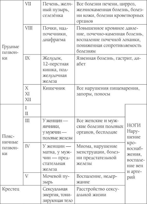Для того чтобы подчеркнуть важность заботы о позвоночнике, приведу ниже в таблице отдельно по каждому позвонку его энергетическую зону действия и наиболее распространенные патологии.