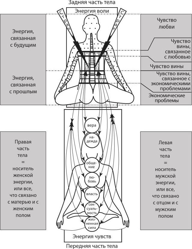 Спереди. Передняя часть тела является выразителем энергии чувств. Все недомогания на передней части тела связаны с негативными чувствами, которые Вы вобрали в себя.