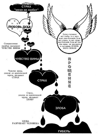 Свои ошибки человек осознает перед смертью. Известно, что у умирающих проходит перед глазами вся жизнь, словно кинопленка. Это происходит как раз для понимания собственных ошибок. Злоба ослепляет. Поэтому у больных раком эта кинопленка проходит перед глазами по многу раз прежде, чем они освободятся от мук. Больной раком, который выучился прощению и правильно его применяет, может выздороветь. Но если болезнь зашла слишком далеко, то больному выпадает счастье уйти из жизни после агонии, длящейся лишь несколько минут.