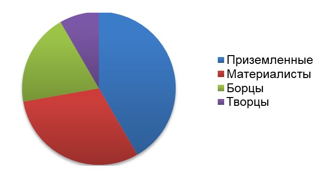Чтобы определить, кто перед вами на собеседовании или при знакомстве – понаблюдайте за человеком. Если больше молчит и рассуждает «примитивненько», но портфолио чудесное – перед вами Приземленный. Если болтает без умолку, хвалит себя и «якает» – Материалист. Надменный взгляд, холодность и распирающее чувство собственного достоинства или вам просто страшно говорить с таким человеком – Борец.