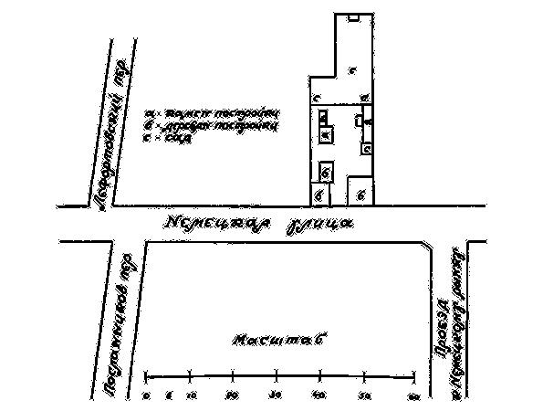 Мерою под тем двором Скворцова было: идучи в него длиннику по правую и левую сторону по 42 саж., поперечнику в переднем конце (на Немецкую улицу) 14 саж., с заднем 7 саж.