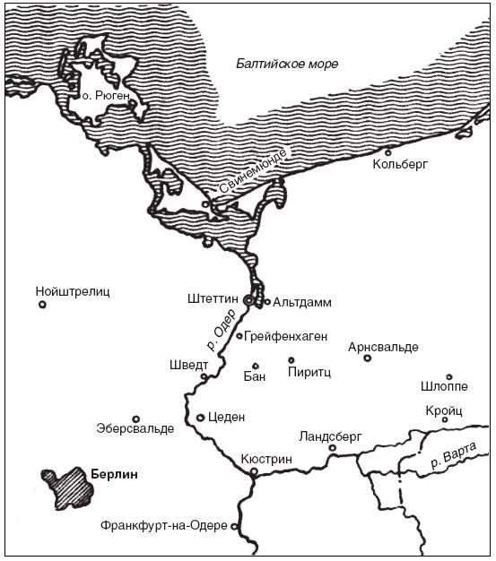 На карте проставлены города, с которыми связаны боевые действия Эрика Валлина, в частности Штеттин, Альтдамм, Шведт, Кюстрин и, конечно, Берлин.