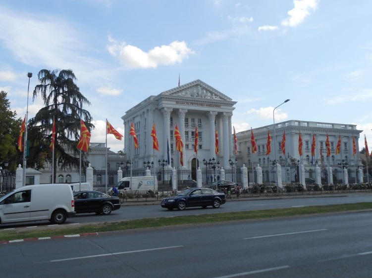 Уже недалеко от стадиона я увидел недавно построенное величественное здание правительства Македонии. Сразу за ним – река Вардар. Именно здесь весной 2017 года (да и не только 2017) проходили многотысячные акции протеста, демонстрации и столкновения.