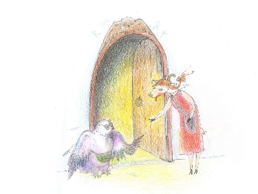 – Увидела? Ну пойдем, не стой, – позвала хозяйка гостью. Она открыла дверь, и Коза увидела ещё лестницу, которая вела куда-то вниз. Они спустились ещё на один этаж и оказались в большой комнате. В стенах этой комнаты было четыре двери. По две напротив друг друга. Над каждой дверью был какой-то, понятный только Сове, знак. Все двери оказались закрыты на большие засовы.