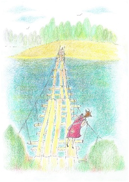 Поднявшись на холм, Коза увидела впереди широкую реку, через которую вел деревянный мост. С этого места было не видно его состояние, и Коза очень надеялась, что по нему можно будет перейти на другую сторону. Вид с холма был очень завораживающий, наша героиня стояла и смотрела по сторонам, как красиво течёт река, какое огромное поле кукурузы, через которое она прошла и это поле казалось просто бескрайним морем, по которому гуляли волны от редких порывов ветра. Она увидела, что на другом берегу нет леса, он был песчаный. И это стало для Козы новым сюрпризом.