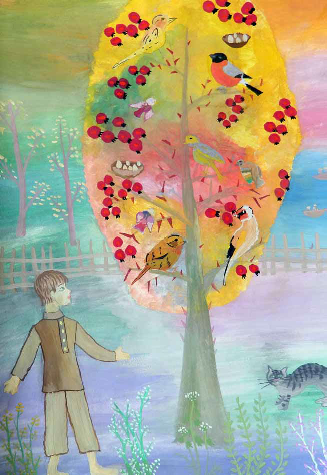 Часами смотрел я на свой саженец. Мне он начинал казаться большой остроиглой бояркой. Вся она была густо запорошена цветами, обвита листвой, потом на ней уголочками загорались ягоды с косточкой, крепкой, что камушек. На боярку прилетала не только мухоловка, но и щеглы, и овсянки, и зяблики, и снегири, и всякие другие птицы. Всем тут хватит места! Дерево-то будет расти и расти. Конечно, боярка высокой не бывает, до неба ей не достать. Но выше сеновала она, пожалуй, вымахает. Я вон как ее поливаю!