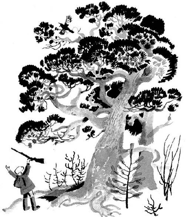 Мальчик стоял неподвижно и не спускал глаз с огромной птицы. Вдруг он вспомнил, что глухаря часто берут с собакой. Охотники рассказывали, что глухарь, сидя на дереве, с любопытством смотрит вниз, на заливающуюся лаем собаку, а порой и подразнивает её. Охотник тем временем незаметно подходит с тыла и стреляет.