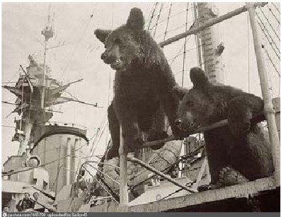 Они пошли к камбузу. Там их встретила огромная толпа матросов, обступивших двух очень маленьких и потешных медвежат, которые, стоя на задних лапах в коридоре, сосали молоко из бутылок под одобрительные крики матросов.