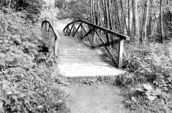 Беседка поставлена как бы на мысу, образованном двумя оврагами. Можно догадаться, что прежде из нее открывался красочный вид далеко окрест, теперь же обзор закрыт разросшимися внизу разлапистыми соснами. От беседки можно пройти по тропке через парк и к прогулочной аллее. Тогда на пути будут заметны справа большие ямы. Откуда они тут?