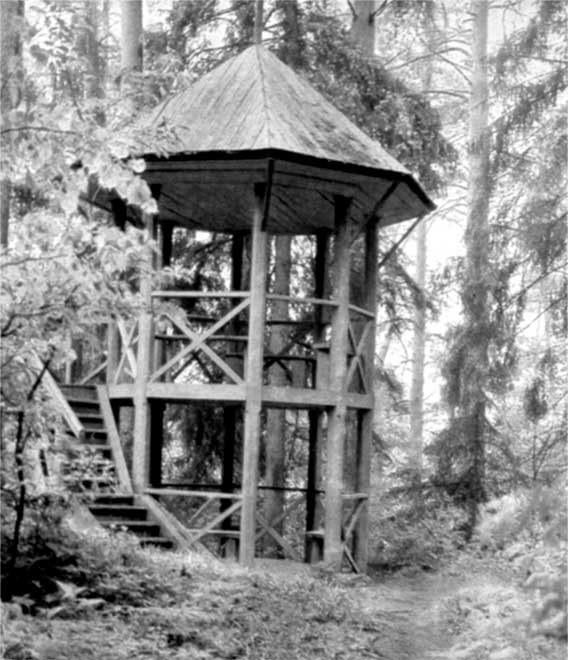 Если пройти от мемориального дома Александра Николаевича Островского по «горбатому» мостику, спуститься еловой аллеей в парк, свернуть по тропинке на запад, перейти еще один мостик, то справа между деревьями на высоком холме можно разглядеть силуэт легкого паркового сооружения. Это двухэтажная деревянная беседка, восьмигранная, с тесовой крышей в виде остроконечного гриба. Внизу стоит стол на одной ножке, у перил – скамейки. Наверх ведет крутая лесенка, ни стола, ни скамеек там нет.