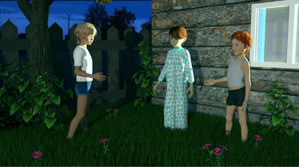 На улице ещё не совсем стемнело. В это время вообще темнеет поздно и ночи совсем короткие. Бабушка с дедушкой уже спали, поэтому ребята потихоньку выбрались в окно.