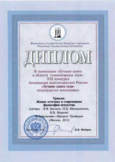 (Бычков В. В., Маньковская Н. Б., Иванов В. В. Триалог. Живая эстетика и современная философия искусства. М.: Прогресс-Традиция, 2012. – 840 с, ил.).
